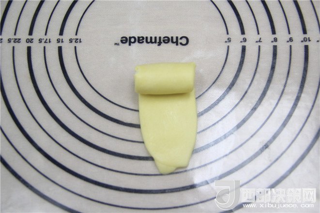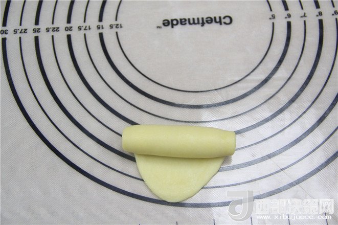 19.將搟好的油酥面團由上往下卷起。