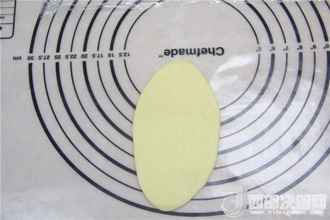 18.油酥面團直立放著,然后用搟面杖搟成長條橢圓。