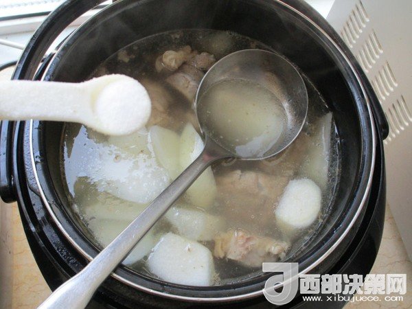 6.等時間到能打開后開蓋把白蘿卜加入,嘗試味道后加鹽調味,再壓5分鐘即可