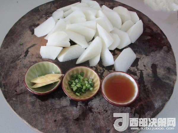 2.把白蘿卜去皮后切成滾刀塊,備好蔥、姜和黃酒
