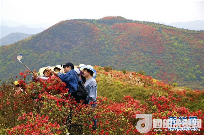 4月10日,游客在安徽銅陵鐘鳴鎮(zhèn)杜鵑山上賞花游玩。 新華社發(fā)(過仕寧 攝)