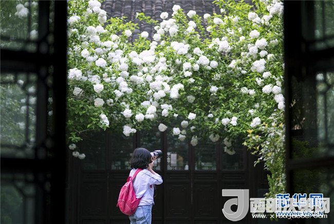 4月11日,一名攝影愛好者在南京清涼山公園拍攝繡球花。 新華社發(fā)(蘇陽 攝)