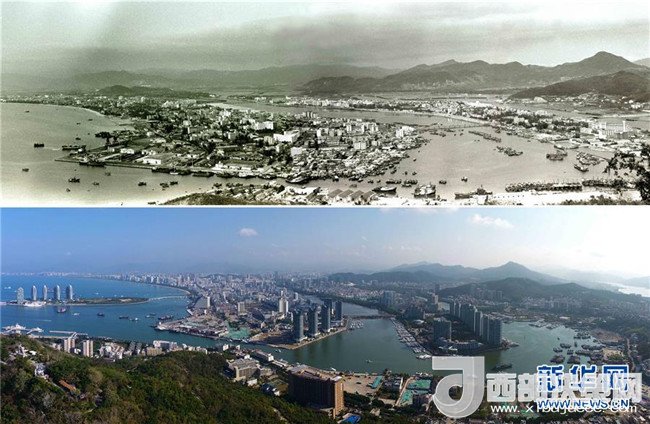 拼版照片為在三亞市鹿回頭景區(qū)鳥瞰三亞市景今昔對比(上圖為1991年2月新華社記者姜恩宇攝,下圖為2018年4月4日新華社記者郭程攝)。