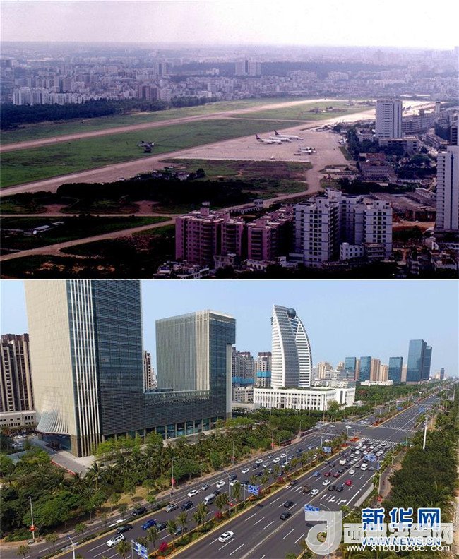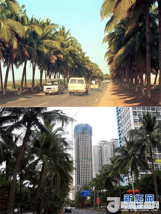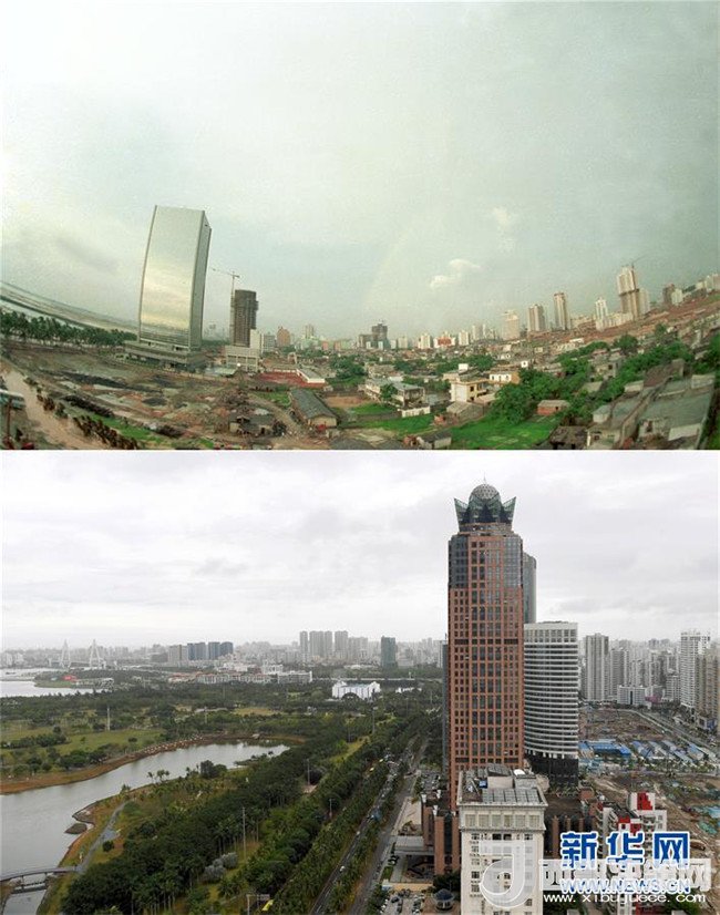 拼版照片為??谑旋埨ツ下方裎魧Ρ龋ㄉ蠄D為1993年6月30日新華社記者姜恩宇攝,下圖為2018年4月14日新華社記者郭程攝)。