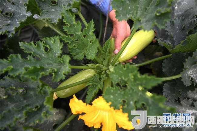 4月18日,一位村民在甘肅省酒泉市肅州區(qū)總寨戈壁農(nóng)業(yè)產(chǎn)業(yè)園的日光溫室內采摘蔬菜。