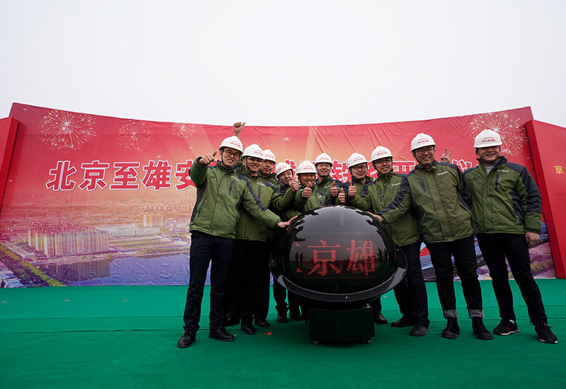 河北雄安新區(qū)首個重大交通項目北京至雄安城際鐵路(簡稱“京雄城際鐵路”)正式開工建設(shè),這是建設(shè)者在開工儀式現(xiàn)場合影留念(2月28日攝)。新華社記者 邢廣利 攝