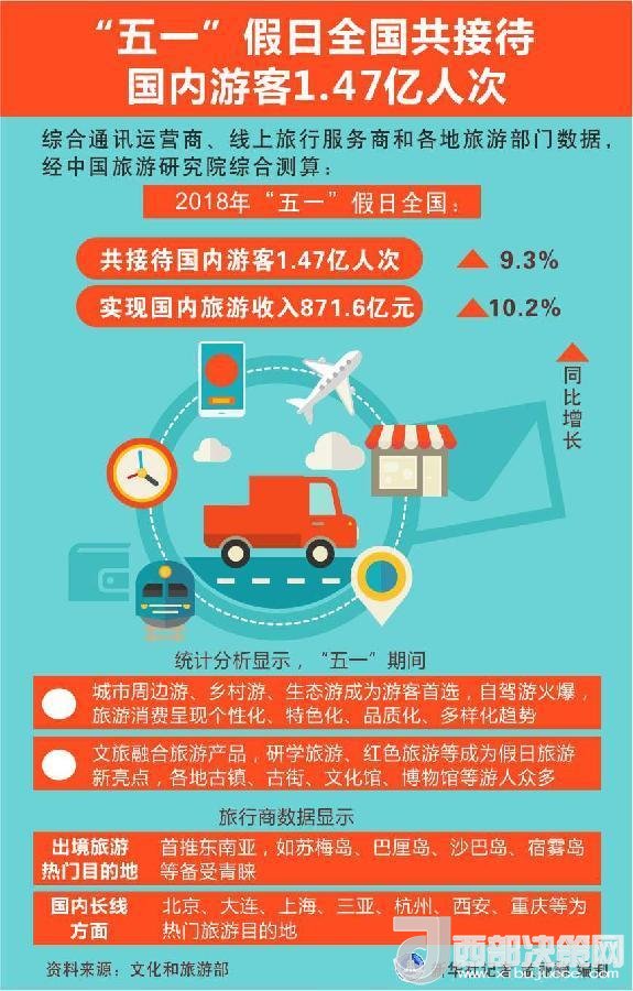 “五一”期間,全國(guó)假日旅游消費(fèi)旺盛,旅游市場(chǎng)持續(xù)增長(zhǎng)。綜合通訊運(yùn)營(yíng)商、線上旅行服務(wù)商和各地旅游部門(mén)數(shù)據(jù),經(jīng)中國(guó)旅游研究院綜合測(cè)算,“五一”假日全國(guó)共接待國(guó)內(nèi)游客1.47億人次,同比增長(zhǎng)9.3%,實(shí)現(xiàn)國(guó)內(nèi)旅游收入871.6億元,同比增長(zhǎng)10.2%。