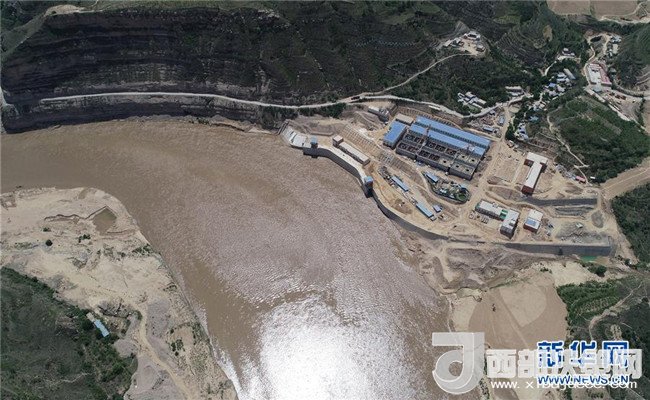 延安黃河引水工程取水樞紐施工現(xiàn)場(5月30日無人機拍攝)。