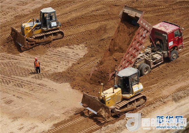 5月30日,工程車輛在延安黃河引水工程南河水庫施工現(xiàn)場進行壩體填筑。