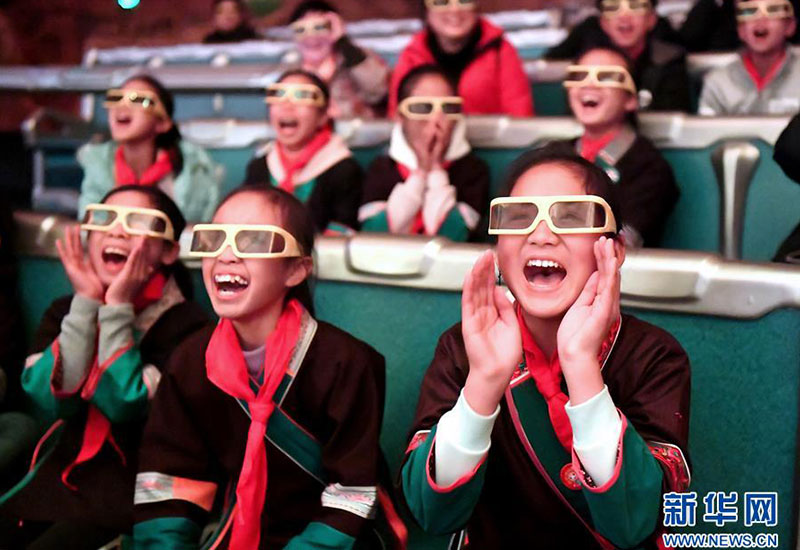 在廣西柳州市景行小學柳東校區(qū),來自三江侗族自治縣和融安縣大山里的留守兒童觀看3D動畫片(1月4日攝)。當日,柳州市舉行關(guān)愛留守兒童城市圓夢活動。新華社發(fā)(黎寒池 攝)