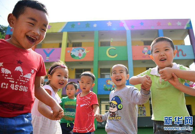 陜西省安康市漢濱區(qū)雙龍鎮(zhèn)杜壩村五四小學附設(shè)幼兒園小朋友們在操場上做游戲(2017年6月16日攝)。這個幼兒園使用貸款資金翻修改造而成,有效解決了該村及周邊兒童學前教育缺失的問題。新華社記者 邵瑞 攝