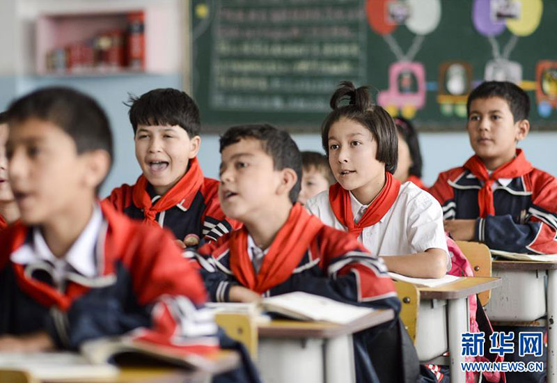 新疆疏附縣托克扎克鎮(zhèn)中心小學5年級1班同學們在上課(2017年9月26日攝)。新華社記者 趙戈 攝