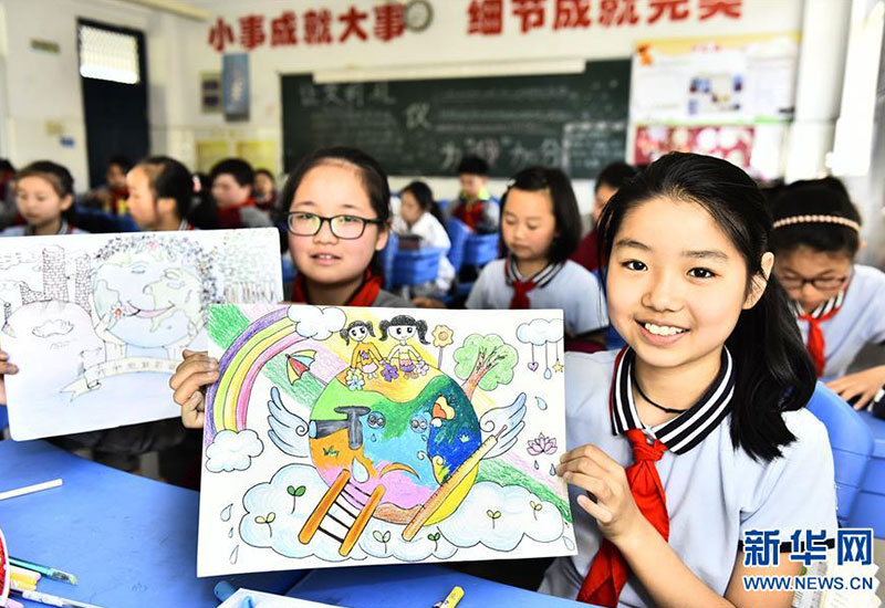 合肥市蜀山區(qū)井崗鎮(zhèn)新城小學學生展示自己在“善待地球,童繪藍天——我與地球的故事”繪畫活動中的作品(4月19日攝)。新華社發(fā)(葛宜年 攝)