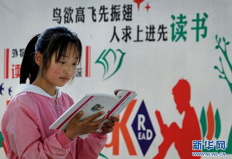 河南焦作市博愛縣寨豁鄉(xiāng)小學學生郭艷冰在校內(nèi)閱讀從“焦作市圖書館館外流通點”借閱的書籍(4月18日攝)。新華社記者 李安 攝