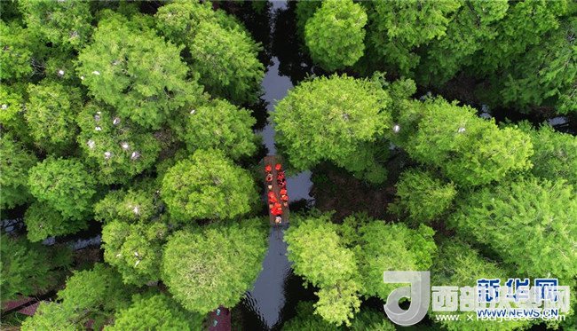 6月5日,游客在江蘇省興化市李中鎮(zhèn)水上森林公園游覽。新華社發(fā)(孟德龍 攝)