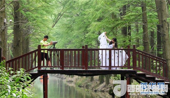 6月5日,游客在江蘇省興化市李中鎮(zhèn)水上森林公園拍照。新華社發(fā)(孟德龍 攝)