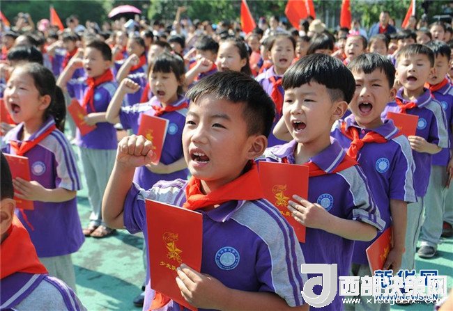 在2017年5月26日安徽省亳州市譙城區(qū)風(fēng)華小學(xué)舉行的入隊(duì)儀式上,孩子們?cè)谛x入隊(duì)誓詞。新華社發(fā)(張延林 攝)