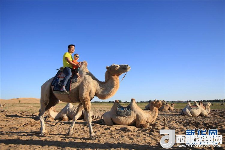 7月25日,一對父子在庫布其沙漠七星湖景區(qū)體驗騎駱駝。 新華社記者 盧燁 攝
