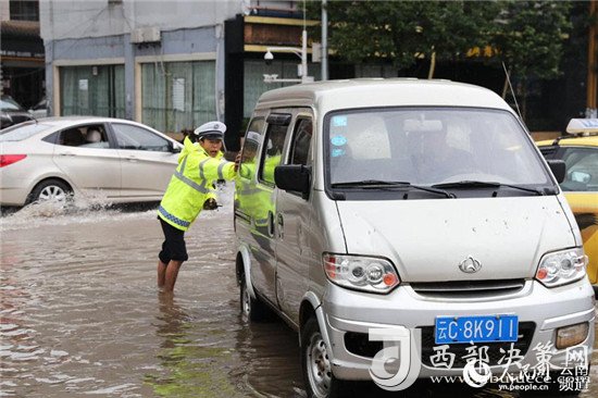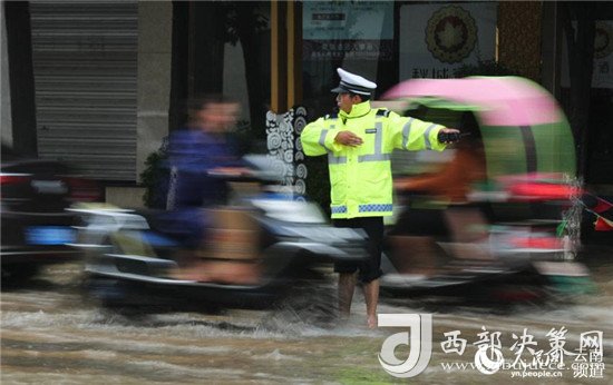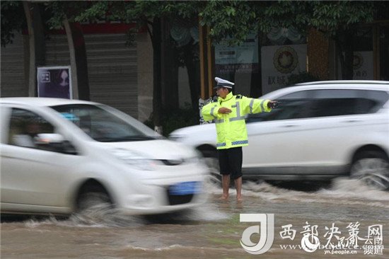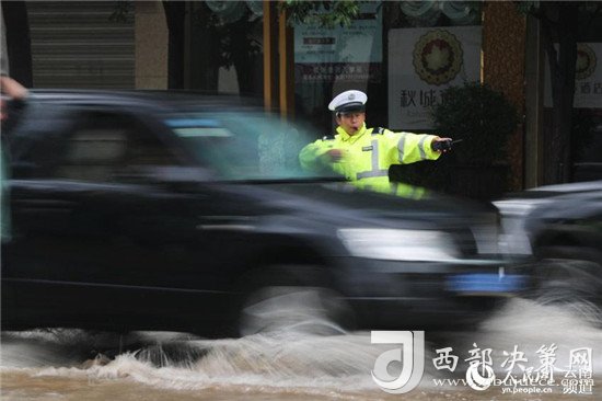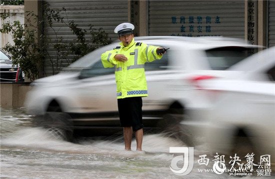 近日,云南昭通大雨導(dǎo)致街道積水嚴(yán)重,昭通中心城市鳳霞路與望海公園環(huán)湖北路交叉口積水最深處達(dá)50公分。一位交警赤腳冒雨在積水中指揮交通幫市民推車的畫面被市民抓拍下來,市民表示,交警赤腳在風(fēng)雨中忙碌工作的身影令人難忘感動(dòng)。 (徐前)