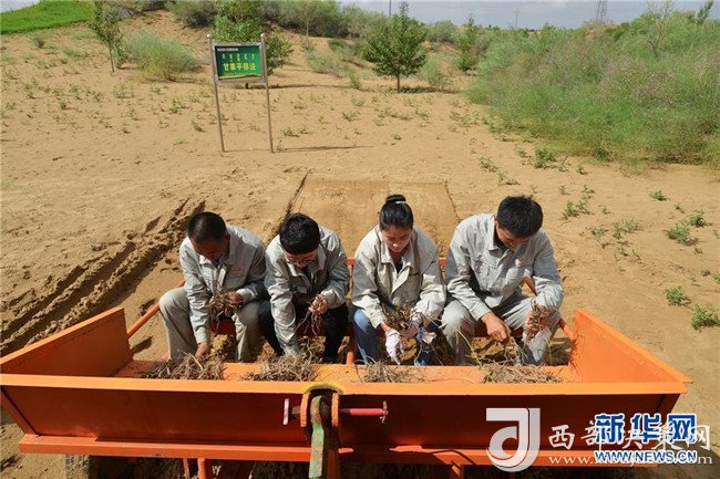 技術人員在位于內(nèi)蒙古鄂爾多斯市杭錦旗的庫布其沙漠示范甘草平移法(7月24日攝)。