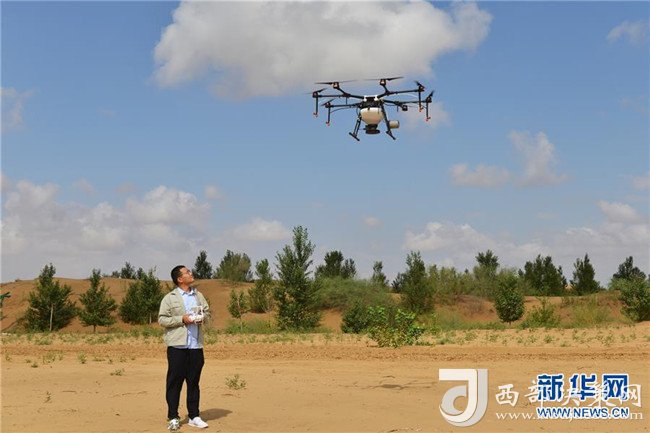 技術人員在位于內(nèi)蒙古鄂爾多斯市杭錦旗的庫布其沙漠里示范無人機植樹(7月24日攝)。 新華社記者 鄒予 攝