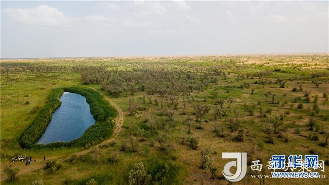 這是位于庫布其沙漠中的七星湖沙漠生態(tài)旅游區(qū)(7月11日無人機拍攝)。 新華社記者 彭源 攝