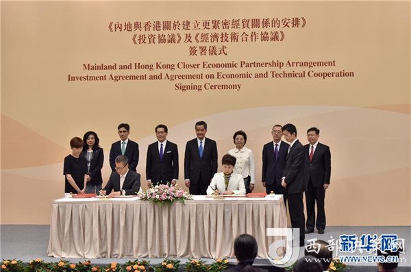 2017年6月28日在香港特區(qū)政府總部拍攝的《內地與香港關于建立更緊密經(jīng)貿關系的安排》(CEPA)下的《投資協(xié)議》和《經(jīng)濟技術合作協(xié)議》簽約儀式現(xiàn)場。 新華社發(fā)(王璽攝)