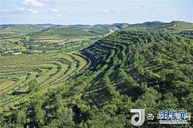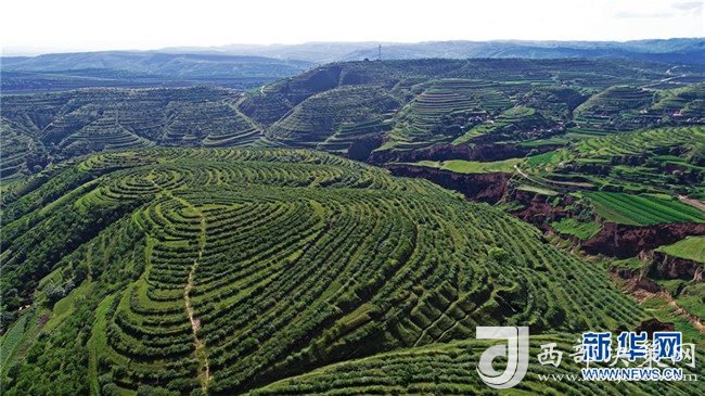 寧夏彭陽(yáng)縣金雞坪梯田公園(7月16日無(wú)人機(jī)拍攝)。