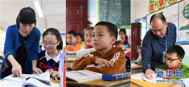 這是一張拼版照片,左圖為:在廣西南寧市馬山縣白山鎮(zhèn)合群初中,溫華芬老師在課后輔導學生功課(4月10日攝);中圖為:在馬山縣白山鎮(zhèn)同富小學,侯宇宸在聽課(4月10日攝);右圖為:在馬山縣白山鎮(zhèn)同富小學,侯瑞良老師在輔導學生功課(4月10日攝)。2017年9月,廣東茂名選派優(yōu)秀教師到廣西馬山縣支教。茂名市電白區(qū)木蘇中學老師溫華芬得知后,與在電白區(qū)陳村中學任教的丈夫侯瑞良積極響應,決定帶上9歲的兒子侯宇宸共同來到馬山縣,開展為期一年的支教活動。新華社記者 陸波岸 攝