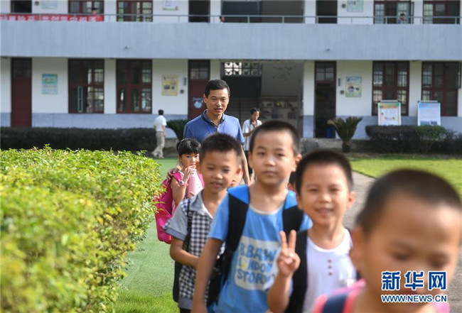 9月6日,福建閩清縣上蓮鄉(xiāng)中心小學教師張鐘在放學后送孩子們回家。2006年,“80后”教師張鐘投身鄉(xiāng)村教育事業(yè),主動要求到偏遠教學點任教。為了能安心工作,他還動員妻子和父母都搬到上蓮鄉(xiāng)工作生活,幫他一起照顧鄉(xiāng)村學校里的孩子們。十多年來,張鐘扎根鄉(xiāng)村,堅守在教書育人的崗位上。新華社記者 林善傳 攝