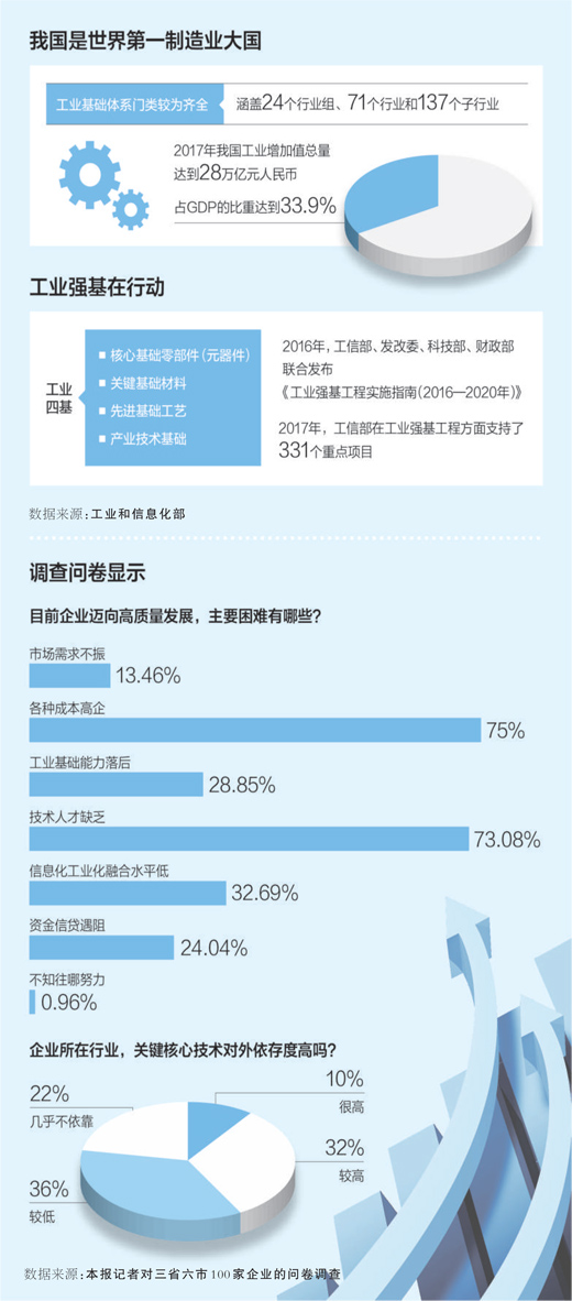 “要實(shí)現(xiàn)從‘有’到‘好’的轉(zhuǎn)變,在高端產(chǎn)品上突破,還需要時間。”調(diào)查中企業(yè)坦言,我國部分核心技術(shù)、關(guān)鍵產(chǎn)品和重大裝備仍存瓶頸制約,一些工業(yè)產(chǎn)品在一致性、穩(wěn)定性和使用壽命方面與國外先進(jìn)水平差距較大,工業(yè)基礎(chǔ)須進(jìn)一步夯實(shí)。