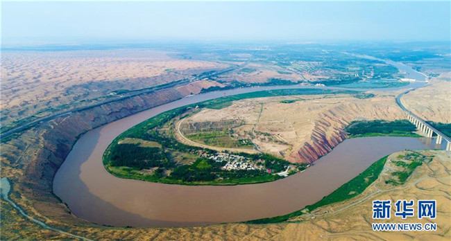 黃河流經(jīng)寧夏中衛(wèi)市騰格里沙漠邊緣(6月26日無人機(jī)拍攝)。 寧夏,地處中國西北腹地。這里的大山、大河、草原、沙漠、湖泊,猶如一幅幅美妙畫卷,讓人流連忘返。 新華社記者 王鵬 攝