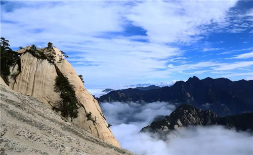 華山的云多變化。有時,天空晴朗,山腰間浮著幾朵白云,像鳥兒在盤旋;有時,一帶云霧纏繞在峰嶺間,絲絲縷縷,如纖纖玉女般纏綿而多情;有時,山谷間被云霧填滿,僅露出一個山尖兒置身其間宛若在仙宮別苑;有時,云海茫茫,云波涌蕩,恍若隔世;有時,云霧包裹了山巒,人就在云中,移步生煙、吐納含瑞被云霧挾裹著,忘記了塵器的凡俗,忘記了世事的究雜,身心全都融化在了這超然的情境當中。