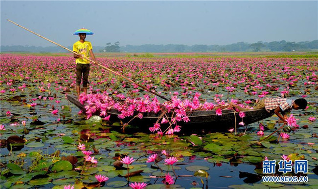 10月7日,在孟加拉國巴里薩爾地區(qū),當?shù)鼐用裨诓烧彙?近日,孟加拉國巴里薩爾地區(qū)的睡蓮進入盛開時節(jié)。 新華社發(fā)(薩利姆·禮薩 攝)