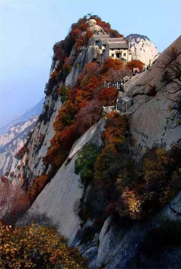 這里的秋天更容易令人迷醉,一步一景步步生情,這里溫度適中,紅葉滿山,山崖為底,松檜為墨,是登山拍攝的最佳季節(jié)。秋風好比一支神奇的彩筆,肆意揮灑,將華山繪成了一幅燦爛的畫卷。從山腳下的郁郁蔥蔥到山頂上的紅黃相間,華山上的每一個臺階都浸染在了紅葉的絢爛中。