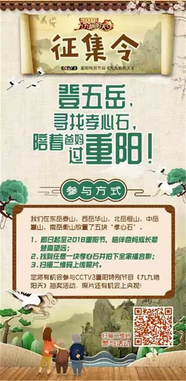 今天是2018年10月17日,農(nóng)歷九月初九重陽(yáng)節(jié)。由中央廣播電視總臺(tái)央視綜藝頻道(CCTV-3)攜手中華五岳名山,共同舉辦的“登五岳 尋找孝心石 陪著爸媽過(guò)重陽(yáng)”暨“福滿(mǎn)華夏 孝行五岳”最美笑容和祝福征集活動(dòng)正在火熱進(jìn)行當(dāng)中,活動(dòng)至10月17日重陽(yáng)節(jié)。只要您陪著爸爸媽媽在五岳任意一塊“孝心石”旁拍下全家福合影,并通過(guò)掃碼填寫(xiě)報(bào)名表格,上傳圖片,就可以參加CCTV-3重陽(yáng)特別節(jié)目《九九艷陽(yáng)天》的抽獎(jiǎng)活動(dòng),照片還有機(jī)會(huì)上央視哦!