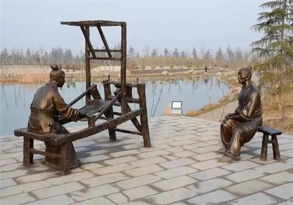 董永,相傳為東漢時(shí)期千乘人,年少喪母,因避兵亂遷居安陸。其后父親亡故,董永賣(mài)身至一富家為奴,換取喪葬費(fèi)用。上工路上,于槐蔭下遇一女子,自言無(wú)家可歸,二人結(jié)為夫婦。女子以一月時(shí)間織成三百匹錦緞,為董永抵債贖身,返家途中,行至槐蔭,女子告訴董永:自己是天帝之女,奉命幫助董永還債。言畢凌空而去。因此,槐蔭改名為孝感。