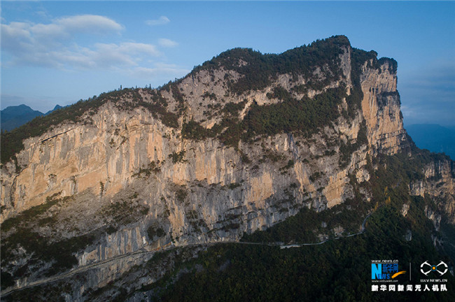 在重慶市開(kāi)州區(qū)滿月鄉(xiāng)雙坪村,一段595米的鄉(xiāng)村公路頗為特殊,被稱(chēng)為“懸崖天路”。新華網(wǎng) 李相博 攝