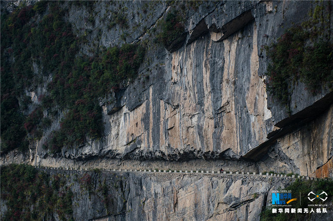 原先,村民進(jìn)出得手腳并用四個(gè)小時(shí),爬過(guò)800米的峭壁。交通的閉塞,阻礙著當(dāng)?shù)氐陌l(fā)展,為了改變貧窮的面貌,當(dāng)?shù)卮迕褡园l(fā)集資修路。新華網(wǎng) 李相博 攝