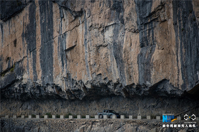 經(jīng)過(guò)一年多的時(shí)間,村民終于人工鑿出這條595米的懸崖公路,給當(dāng)?shù)貛?lái)了希望。新華網(wǎng) 李相博 攝