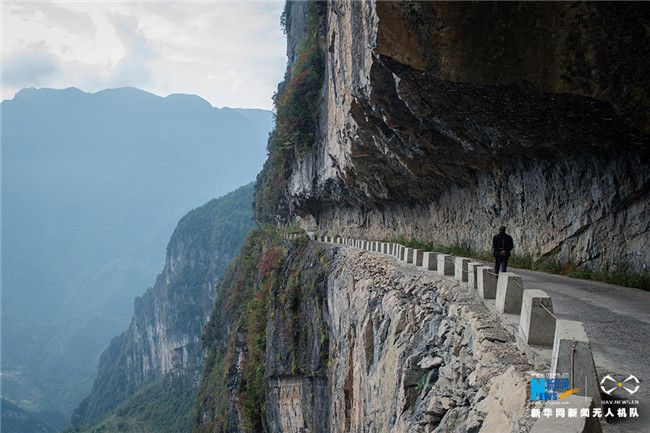 稱(chēng)其“懸崖天路”,來(lái)源于其險(xiǎn)要的地勢(shì)——上方是巖石,外側(cè)是懸崖峭壁。由于地處海拔1500米的高山,常有云霧繚繞,驚險(xiǎn)萬(wàn)分。新華網(wǎng) 李相博 攝