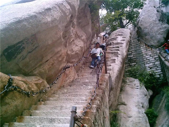 “千尺幢”在華山峪古道“回心石”上,是經(jīng)華山峪登主峰的必經(jīng)之道。這里原為一崖間裂隙,直立70度,后來人們沿隙鑿?fù)爻陕?,有石階370級,階寬僅容半足,游人登臨時,仰視一線天,俯視若臨深井。