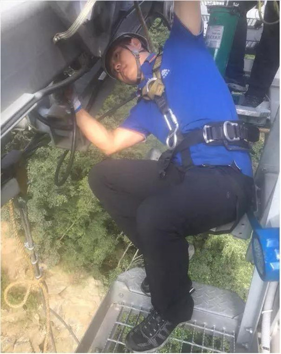 索道維護(hù)工每隔2小時(shí)坐檢修車沿索道線巡查一次。檢修車四面敞開(kāi)、像個(gè)吊籃一樣。坐在全封閉的索艙里,尚有游客嚇得大喊大叫,站在四面敞開(kāi)的檢修車上的感覺(jué)可想而知。