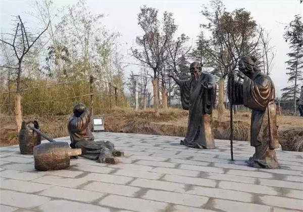 董永,相傳為東漢時期千乘人,年少喪母,因避兵亂遷居安陸。其后父親亡故,董永賣身至一富家為奴,換取喪葬費用。上工路上,于槐蔭下遇一女子,自言無家可歸,二人結為夫婦。女子以一月時間織成三百匹錦緞,為董永抵債贖身,返家途中,行至槐蔭,女子告訴董永:自己是天帝之女,奉命幫助董永還債。言畢凌空而去。因此,槐蔭改名為孝感。