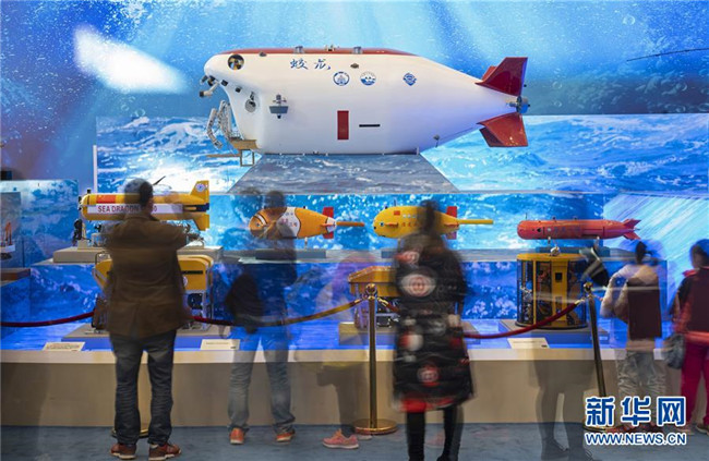 11月18日,觀眾在觀看“蛟龍”號(hào)載人潛水器等模型(慢門拍攝)。“偉大的變革——慶祝改革開放40周年大型展覽”11月13日在國家博物館隆重開幕。自開幕以來,展覽吸引了眾多參觀者。新華社記者 才揚(yáng) 攝
