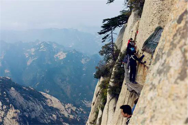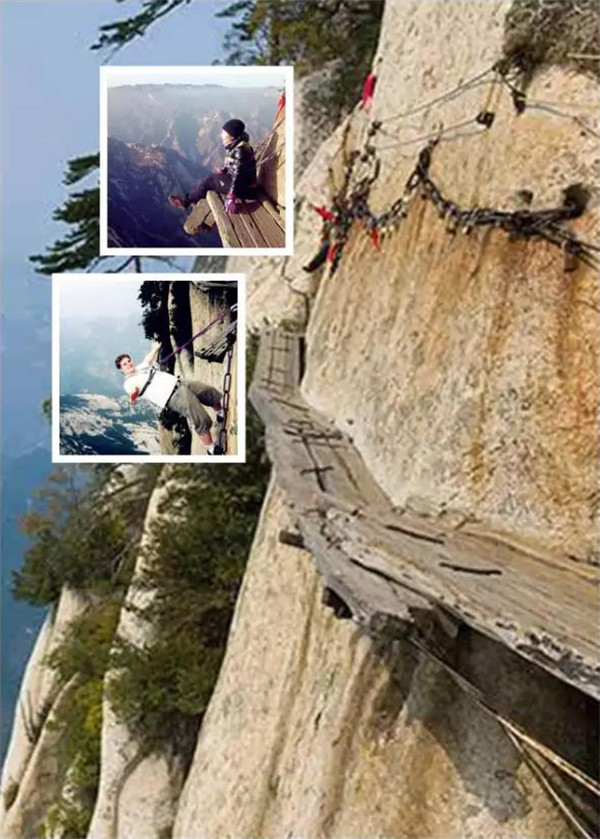 西岳華山歷來被認(rèn)為是五岳之中最為險(xiǎn)峻的,而在華山中,險(xiǎn)中之險(xiǎn)莫過于“長空棧道”和“鷂子翻身”。特別是具有700多年歷史的長空棧道,在華山南峰東側(cè)山腰的萬仞絕壁上鑿出來的幾個(gè)踏腳之處,鑲嵌石釘搭木椽搭建了一個(gè)百余米懸空的棧道,讓人望而卻步,如果你有恐高癥,僅僅看一眼都會讓你驚恐萬分。2013年,著名旅游網(wǎng)站“Smarter Travel”盤點(diǎn)全球最恐怖懸崖步道,將華山長空棧道列為全球十大最恐怖的懸崖步道之一。