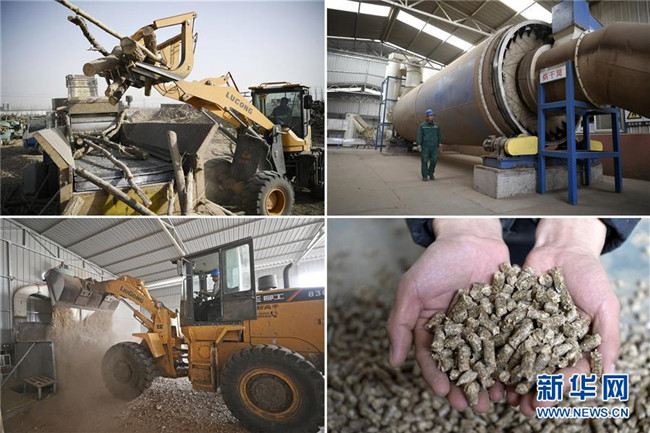 這是由11月27日拍攝的照片組成的拼版照片:左上圖為粉碎設(shè)備將秸稈、廢棄木材初步粉碎;右上圖為秸稈、廢棄木材經(jīng)過(guò)粉碎后進(jìn)行烘干處理;左下圖為工作人員用鏟車將初步粉碎的渣料填入機(jī)器進(jìn)行處理;右下圖為秸稈、廢棄木材制成的生物質(zhì)顆粒燃料。