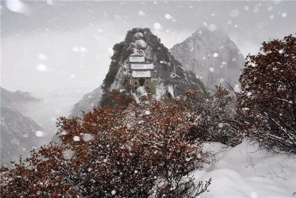 雪落華山,圣潔的雪花把華山妝扮得分外妖嬈嫵媚,平日陡峭的巖石,象穿著潔白的羽衣,宛若天仙般亭亭玉立于峰頭路旁,似向游人拂疑,微笑致意,最讓為之從心里震顏起敬的是,華山雪中松樹的雄姿與風(fēng)情。