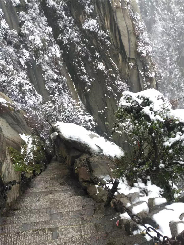 大概到了千尺幢,路就非常陡峭了,幾乎垂直攀登。戴上手套,登山杖收進(jìn)背包,抓緊鐵鏈子,懸崖外寒風(fēng)呼嘯,雨雪交加,絕壁上的古松巍然屹立,驢友相互鼓勵(lì)有說有笑,天冷,但心是熱的。