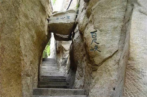 幢去峽復(fù)來(lái),天險(xiǎn)不可瞬。雖云百尺峽,一尺一千仞。”過(guò)千尺幢向北折即到“百尺峽”,它也叫“百丈崖”,仍是一處危石聳峙,直插云表,令人望而生畏的地方。峽的兩壁欲合,卻被飛來(lái)的兩顆石塊從中撐開(kāi),人從石頭下鉆過(guò),膽戰(zhàn)心驚,生怕石塊從兩壁間掉下來(lái),這就是“驚心石”。通過(guò)此石懸著的心才放下來(lái),再回頭看原來(lái)此處卡著的兩塊石頭,是上大下小故能安然無(wú)恙,所以這顆石頭也被稱之為“平心石”。故韓愈詩(shī)中有“俄然神功就,殺氣見(jiàn)棱角”的描寫(xiě)。